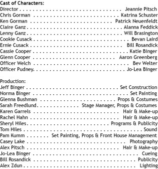 The Tin WomanLate July, 2024 By Sean Grennan Directed by Roxie Wetterau Published by Playscripts, Inc. A young woman receives a heart transplant, but the gift of life that represents also causes her to wonder at the cost to the family of the donor. An intimate and poignant play, THE TIN WOMAN explores the power of human connection. "The Tin Woman" Cast of Characters: ● Joy . . . Carly Rhyner ● Jack . . . Andrew Spencer ● Hank . . . Greg Jackan ● Alice . . . Rebecca Niese ● Sammy . . . Grace Engel ● Darla . . . Montana Smith-Frome ● Nurse . . . Connie Michalski ![]() ![]() ![]()