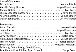 Written by Robert Harling The story is set in Truvy's Louisiana beauty parlor where women who are "anybody" come to have their hair done. Helped by her eager new assistant, Annelle, the outspoken, wise-cracking Truvy dispenses shampoos and free advice to her customers, Miss Clairee, Ouiser, and M'Lynn, whose daughter Shelby, is about to wed. Filled with hilarious situations and revealing verbal collisions, the play moves toward tragedy when Shelby risks pregancy and forfeits her life. The realization of their mortality affects all, and gives the play and its characters the special qualities to make them truly touching, funny and good company in both good and bad times.